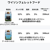タンパク質60%以上、脂質15%以上、炭水化物5%以下という構成で、野生動物の体組成に近づけた栄養設計。遺伝学的に適正な栄養を実現しています。