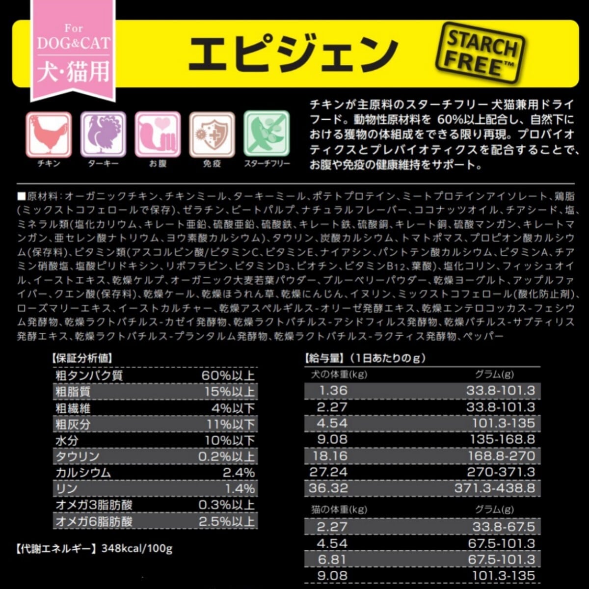 Epigen™は、動物性原材料を60%使用し、デンプン(スターチ)を一切含まない成犬・成猫向けの総合栄養食です。