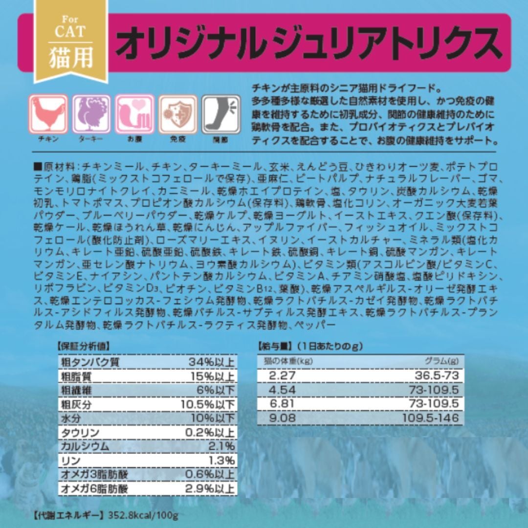 オリジナル ジュリアトリクスはタンパク質を豊富に含んだシニア猫用総合栄養食です。